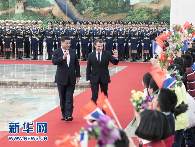 1月9日,國家主席習近平在北京人民大會堂同法國總統馬克龍舉行會談。這是會談前,習近平在人民大會堂北大廳為馬克龍舉行歡迎儀式。新華社記者王曄 攝