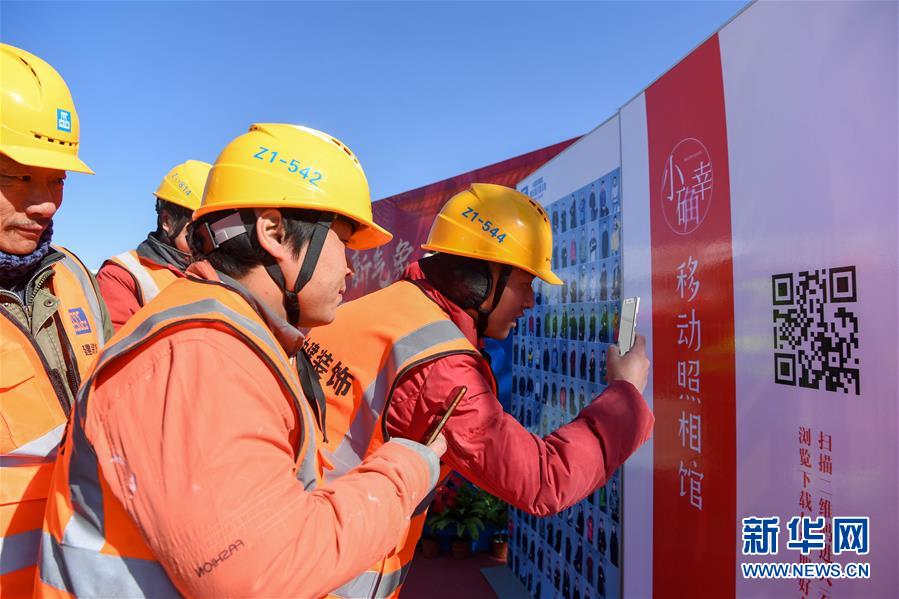 2月12日,在雄安市民服務中心項目現場,剛剛拍攝完紀念照的工人在掃描二維碼下載照片。當日,“雄安建設者幸福過大年活動”在雄安市民服務中心項目現場舉行,中建裝飾集團為堅守在崗位上的建設者們帶來新春慰問品,并設立“小確幸”移動照相館,工人隨時可以進入移動照相館,在新年的雄安定格下一張有著特殊意義的紀念照,并通手機掃描二維碼下載照片,傳遞給親人,分享快樂。新華社記者 申宏 攝