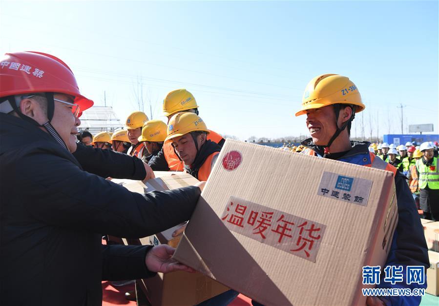 2月12日,在雄安市民服務中心項目現場舉行的“雄安建設者幸福過大年活動”上,工人們領到新春慰問品——“年貨大禮包”。當日,“雄安建設者幸福過大年活動”在雄安市民服務中心項目現場舉行,中建裝飾集團為堅守在崗位上的建設者們帶來新春慰問品,并設立“小確幸”移動照相館,工人隨時可以進入移動照相館,在新年的雄安定格下一張有著特殊意義的紀念照,并通手機掃描二維碼下載照片,傳遞給親人,分享快樂。新華社記者 申宏 攝