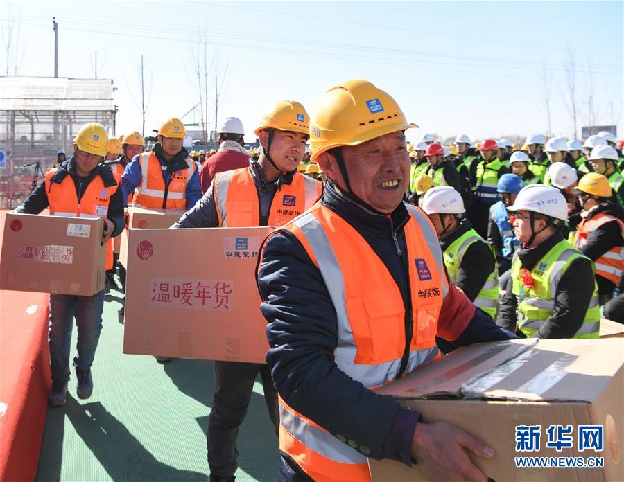 2月12日,在雄安市民服務中心項目現場舉行的“雄安建設者幸福過大年活動”上,工人們領到新春慰問品——“年貨大禮包”。當日,“雄安建設者幸福過大年活動”在雄安市民服務中心項目現場舉行,中建裝飾集團為堅守在崗位上的建設者們帶來新春慰問品,并設立“小確幸”移動照相館,工人隨時可以進入移動照相館,在新年的雄安定格下一張有著特殊意義的紀念照,并通手機掃描二維碼下載照片,傳遞給親人,分享快樂。新華社記者 申宏 攝