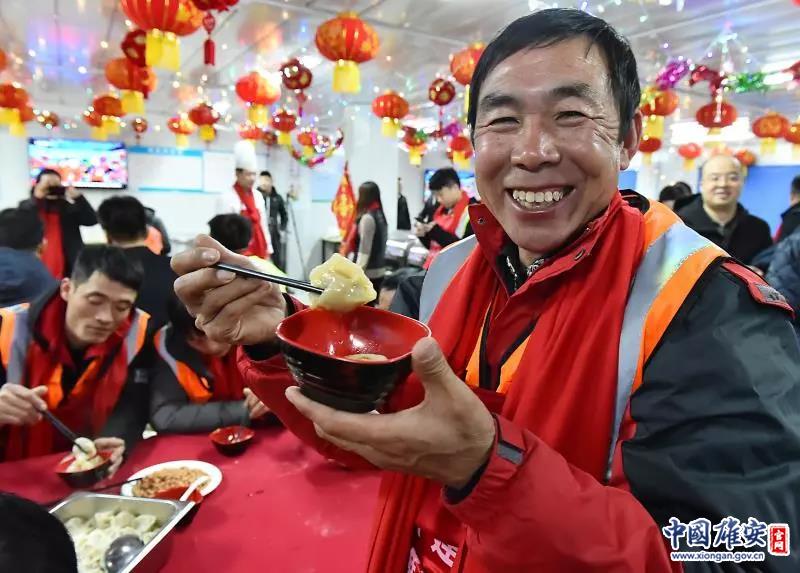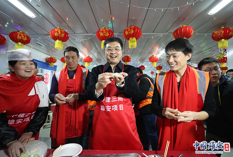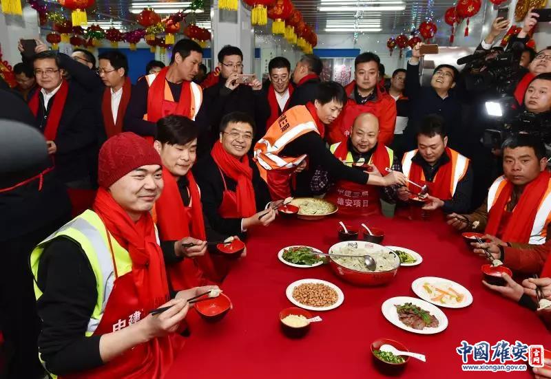 2月15日,除夕夜,河北省委常委、副省長、雄安新區黨工委書記、管委會主任陳剛一行,與3000余名堅守在雄安市民服務中心項目的建設者們,一起合唱《歌唱祖國》、共同包餃子煮餃子、搞聯歡、話雄安,在歌舞歡騰中共同迎接雄安新區的第一個春節。