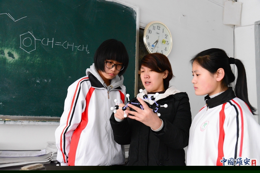 化學老師曹蘭英(中)和學生們在一起。王京卓攝