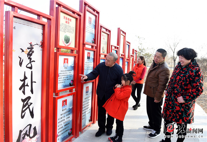 2月20日,游客在雄安新區(qū)雄縣昝東村黨建主題公園“淳樸民風(fēng)”展示牌前參觀。