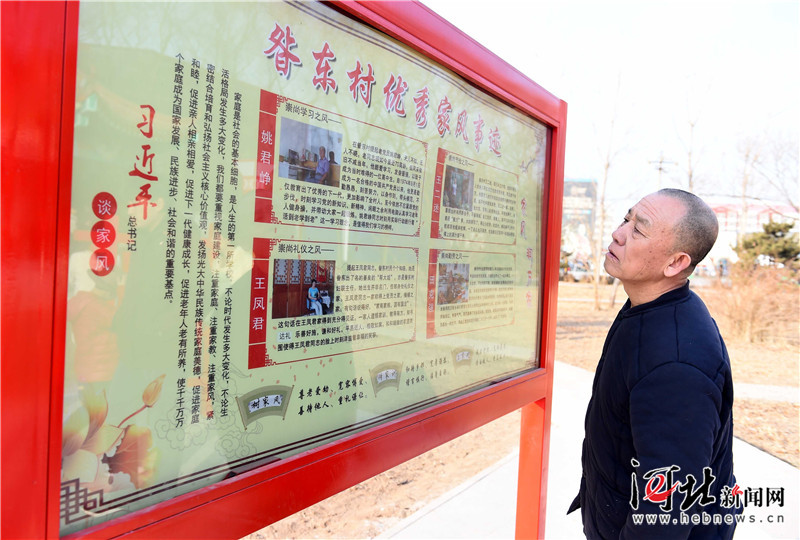 2月20日,游客在雄安新區(qū)雄縣昝東村黨建主題公園“文明家風(fēng)”展示牌前參觀。