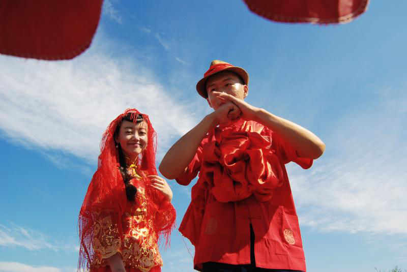 新娘臉上洋溢著幸福的笑容,新郎拱手作揖。 朱昆侖/圖 劉琪/文
