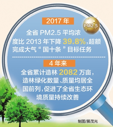 “中國塞罕壩林場建設者”榮獲聯合國環保最高榮譽“地球衛士獎”;去年第四季度石家莊市空氣質量綜合指數和PM2.5平均濃度分別同比下降48%、54.8%,在京津冀大氣污染傳輸通道“2+26”城市中降幅排名“雙第一”……近年來,我省建設京津冀生態環境支撐區持續發力,生態環境質量明顯改善。2017年,全省PM2.5平均濃度比2013年下降39.8%,超額完成大氣“國十條”目標任務;全年完成造林綠化536萬畝,年造林面積再創歷史新高,全省森林覆蓋率提高到33%。