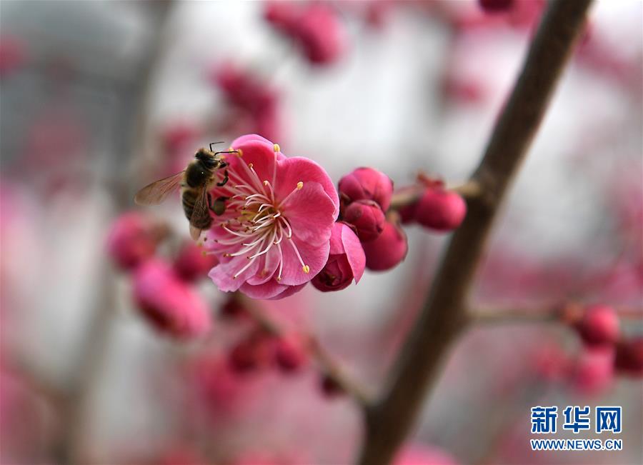 3月14日,在河北省石家莊市民心河畔,蜜蜂在花間采蜜。新華社發(fā)(張震 攝)