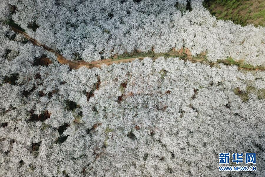 這是航拍的貴州省貴安新區櫻花園(無人機3月14日拍攝)。 新華社記者 歐東衢 攝