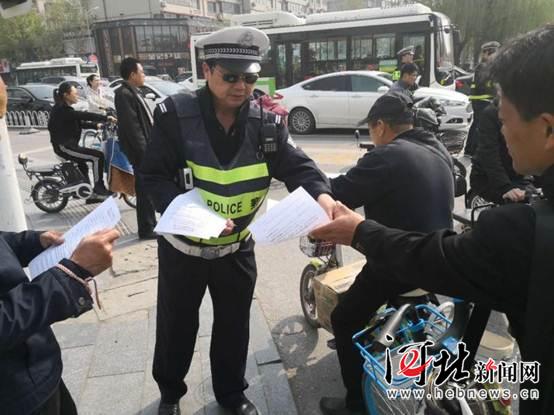4月17日,保定市公安交警部門啟動實施號稱“史上最嚴”交通違法整治。圖為交警在路上向行人發放整交明白紙。高峰攝