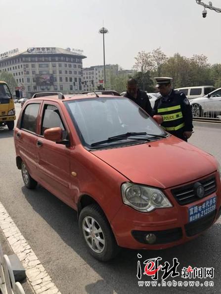 上午10時許,在恒祥大街與東風路交叉口,執勤民警正在給過往的駕駛人和行人發放《保定市公安局交警支隊嚴整交通違法行為30條》明白紙,明白紙明確了30條交通違法行為和處罰標準。正在此時,一名中年男子駕駛一輛橘紅色老年代步車行駛至此,因該車未懸掛號牌被在此執法的交警依法攔截。經查,駕駛人王某未取得機動車駕駛證,屬于無牌無證上路行駛。根據《中華人民共和國道路交通安全法》交警暫扣了其機動車,并對王某處1000元罰款。
