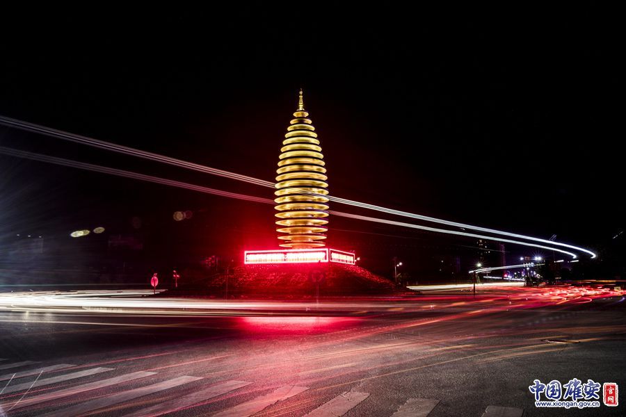 夜幕中容城縣地標建筑容和塔,大車車頂燈駛向奧威路后,在夜空留下一道絢麗的光。
