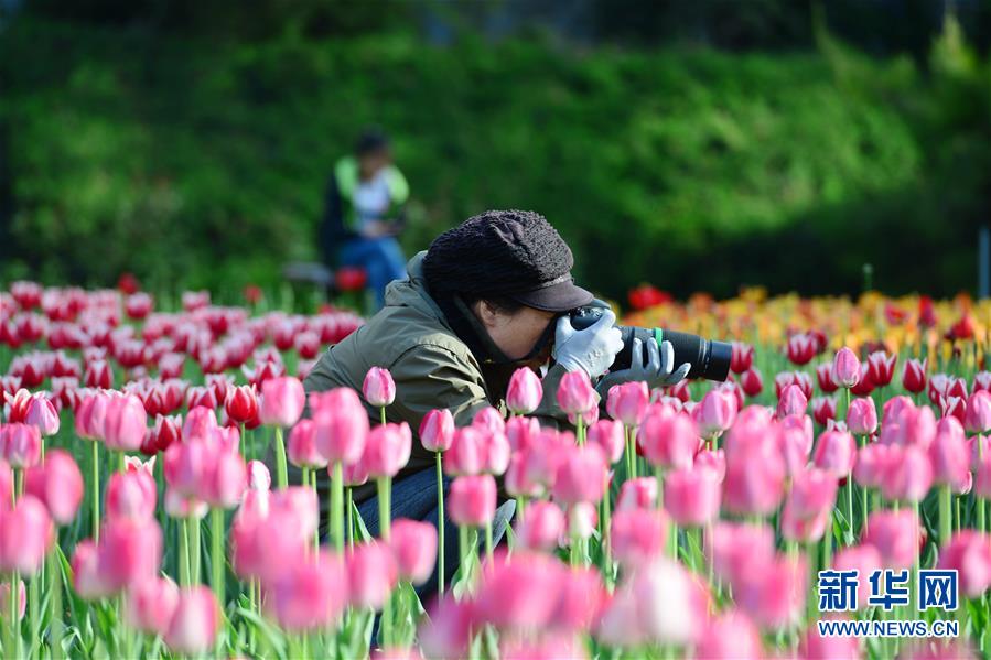 4月24日,一名攝影愛好者在北京交通大學校園內拍攝盛開的郁金香。新華社發(楊素平 攝)