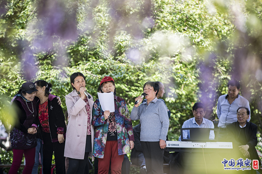 4月25日,雄安新區(qū)容城縣新容廣場。紫藤花下正在練歌的人們。 王永康 攝