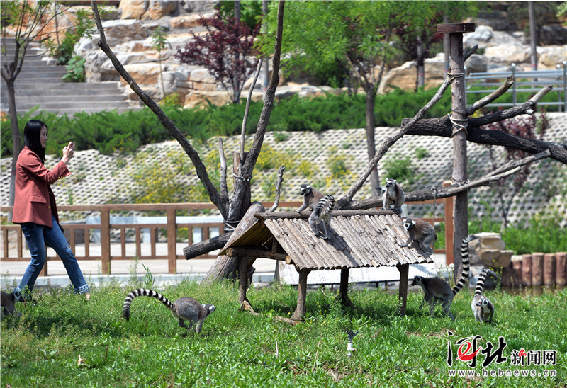 4月26日,游客正在石家莊動物園近距離觀察環尾狐猴。