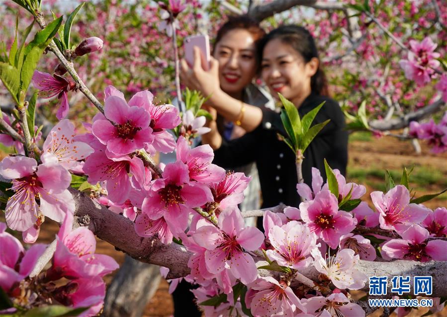 4月27日,游客在北戴河區費石莊村盛開的桃花前拍照。近日,河北省秦皇島市北戴河區聯峰山腳下費石莊村附近的桃花競相綻放,吸引眾多游客前來踏青賞花。 新華社記者 楊世堯攝