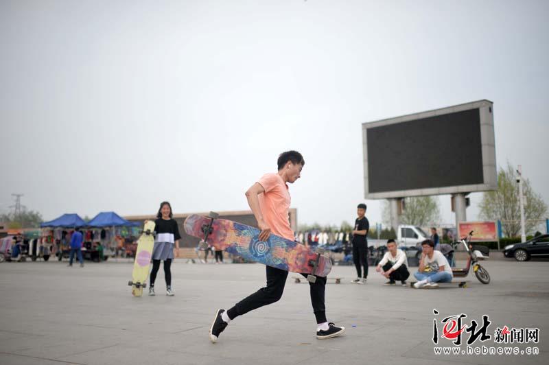 容城縣三賢廣場,25歲的設計師李祎明閑暇之余和小伙伴們一起玩滑板。作為年輕一代的家鄉建設者,他們充滿活力。