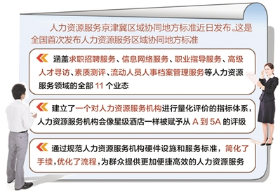 近日,京津冀人社部門和質監部門在北京召開新聞發布會,發布人力資源服務京津冀區域協同地方標準。這是全國首次發布人力資源服務區域協同地方標準。該標準將于8月1日起正式實施。屆時,三地人力資源服務將更加規范,求職者在三地都能享受同樣標準的人力資源服務。