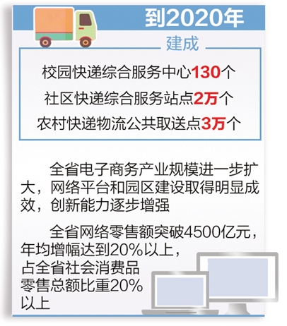 到2020年,快遞物流節點布局更加優化,基礎設施數字化水平顯著提升,電商物流末端服務能力明顯提高,智慧快遞物流服務體系基本建立,電子商務與快遞物流更加高效協同,全省快遞業務量達到25億件,年均增幅30%以上。建成校園快遞綜合服務中心130個,社區快遞綜合服務站點2萬個,農村快遞物流公共取送點3萬個。