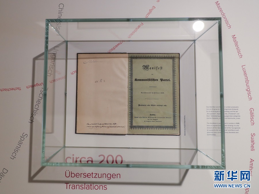 歷史長河奔流不息,真理之光穿越時空。1818年5月5日,德國小城特里爾,一代偉人馬克思誕生。200年后,世界東方。高擎馬克思主義的精神火炬,在習近平新時代中國特色社會主義思想指引下,中國共產黨正領導億萬人民書寫人類發展史上新的奇跡。這是2018年5月3日在德國特里爾馬克思故居紀念館內拍攝的1848年出版的《共產黨宣言》第一版。 新華社記者 單宇琦 攝