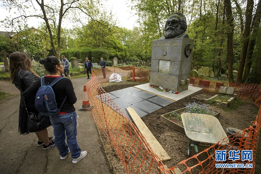 歷史長河奔流不息,真理之光穿越時空。1818年5月5日,德國小城特里爾,一代偉人馬克思誕生。200年后,世界東方。高擎馬克思主義的精神火炬,在習近平新時代中國特色社會主義思想指引下,中國共產黨正領導億萬人民書寫人類發展史上新的奇跡。這是2018年5月3日,在英國倫敦北部海格特公墓,人們來到正在進行維修的馬克思墓前參觀。 新華社發(蒂姆·愛爾蘭攝)