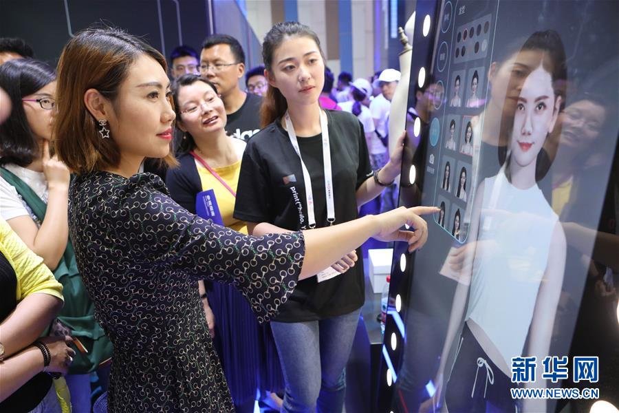 5月26日,參觀者在數(shù)博會(huì)上通過(guò)阿里巴巴的虛擬試衣鏡現(xiàn)場(chǎng)試衣。當(dāng)日,2018中國(guó)國(guó)際大數(shù)據(jù)產(chǎn)業(yè)博覽會(huì)在貴州省貴陽(yáng)市開幕。本次數(shù)博會(huì)上,無(wú)人駕駛、虛擬試衣鏡等“黑科技”引人關(guān)注。 新華社記者 歐東衢攝