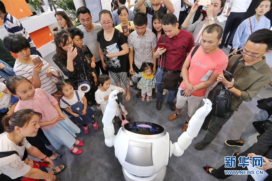 5月26日,參觀者在數博會上觀看跳舞的小i機器人。當日,2018中國國際大數據產業博覽會在貴州省貴陽市開幕。本次數博會上,無人駕駛、虛擬試衣鏡等“黑科技”引人關注。 新華社記者 歐東衢攝