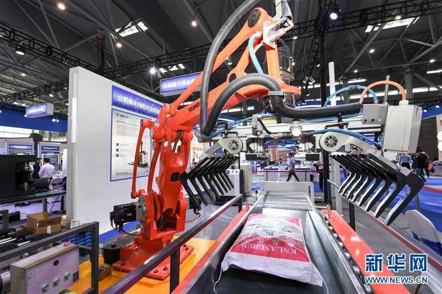 在2018世界制造業大會上,一款碼垛機器人亮相(5月25日攝)。無需土壤,幾臺水箱和一瓶營養液即可打造“家庭農場”;手掌大小的機器人也有“洪荒之力”,智能搬運“龐然大物”;與30多種語言實時互譯,人工智能讓你輕松追逐“詩和遠方”……于安徽合肥舉行的2018世界制造業大會上,一批前沿技術和創新成果集中亮相。在創新引領下,中國制造正逐步顯現新的發展圖景。這一點,從世界制造業大會上就能明顯感知。 新華社記者 張端 攝