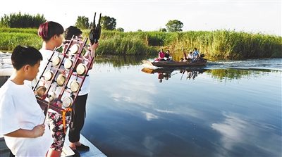 夕陽下,安新縣圈頭村的樂手乘船在淀上練習古曲,悠揚的樂聲在蘆葦蕩間久久回蕩,吸引了眾多游客的目光。圈頭村音樂會作為國家級非遺項目,在白洋淀遠近聞名。