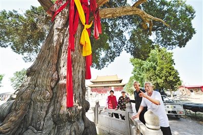 容城縣晾馬臺村的老人講述晾馬臺遺址中千年古柏的歷史。