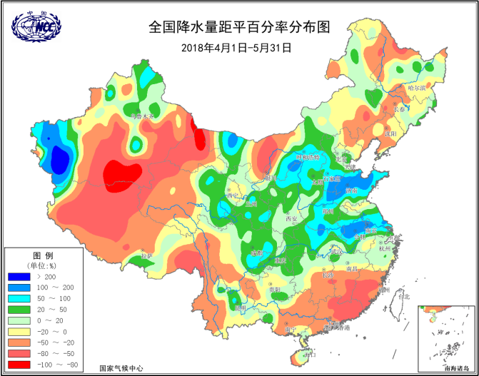 陳麗娟:4月以來,我國氣候波動較大,雨季進程偏晚,雖然全國平均降水量接近常年同期,但降水呈現“北多南少”格局,空間分布極不均勻。主要特點有: