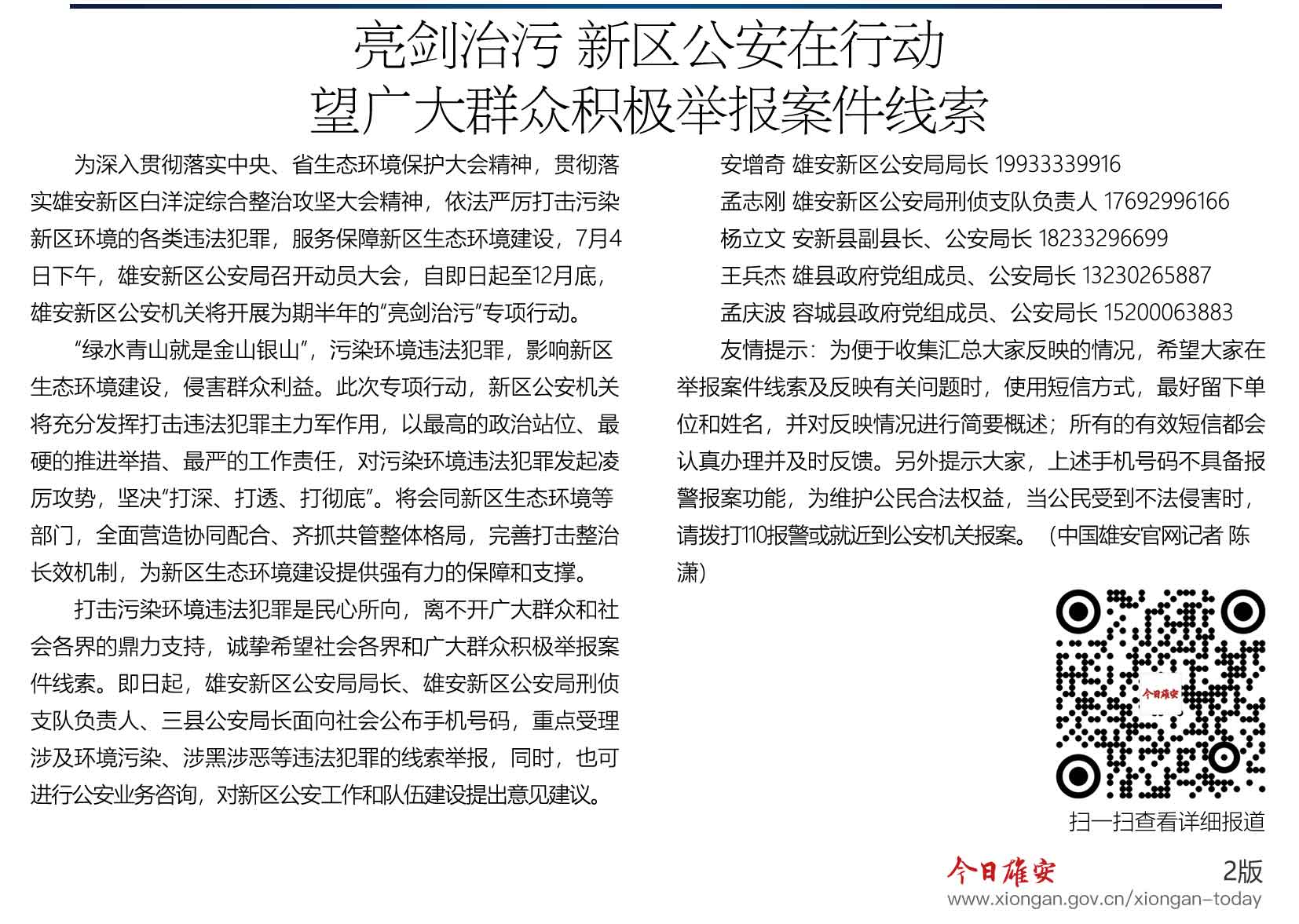 7月4日下午,雄安新區公安局召開動員大會,自即日起至12月底,雄安新區公安機關將開展為期半年的“亮劍治污”專項行動。
