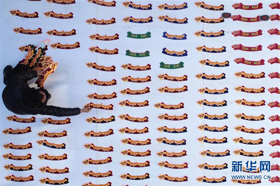 12月14日,河北省任縣三北張村村民尚海如在晾曬虎頭鞋鞋幫(無(wú)人機(jī)拍攝)。 新華社發(fā)(陳雷 攝)