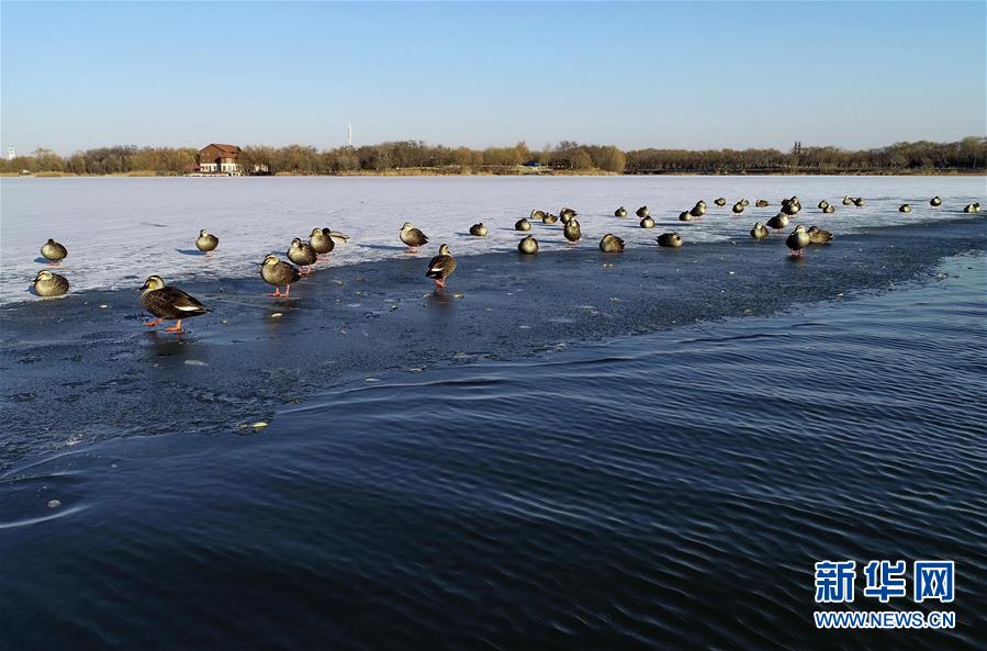12月14日,水鳥在唐山南湖的冰面上棲息(無人機拍攝)。