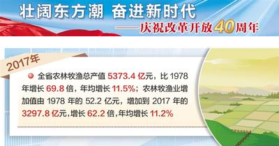 省統計局提供的數據顯示,2017年,全省農林牧漁總產值5373.4億元,比1978年增長69.8倍,年均增長11.5%;農林牧漁業增加值由1978年的52.2億元,增加到2017年的3297.8億元,增長62.2倍,年均增長11.2%。