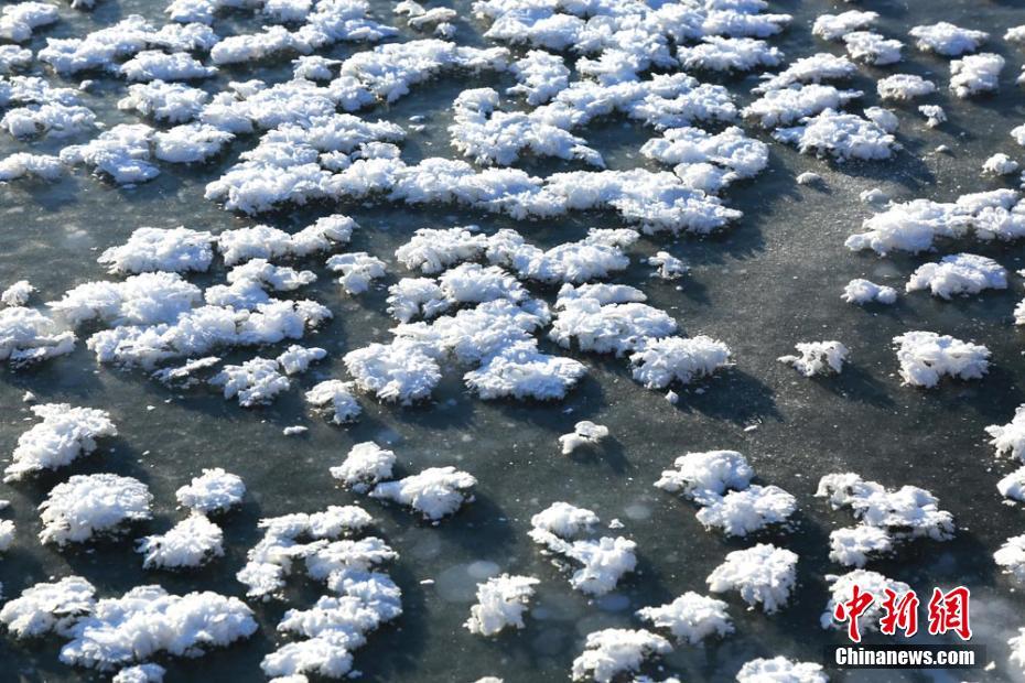 近日,受強冷空氣影響,地處甘肅省河西走廊中段的張掖市降溫降雪。該市濱河新區蘆水灣景區的湖面結冰,冰面上自然形成的冰花,猶如朵朵白花盛開,鋪滿了湖面。圖為湖面上"盛開"的冰花。陳禮 攝