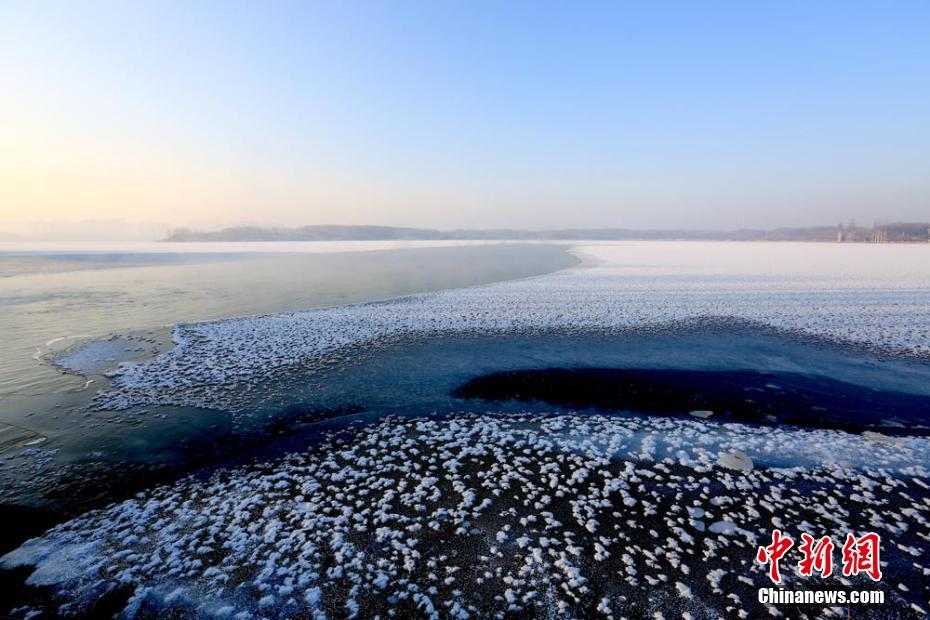 近日,受強冷空氣影響,地處甘肅省河西走廊中段的張掖市降溫降雪。該市濱河新區蘆水灣景區的湖面結冰,冰面上自然形成的冰花,猶如朵朵白花盛開,鋪滿了湖面。圖為藍天下的湖面"半江流水淙淙半江白"。陳禮 攝