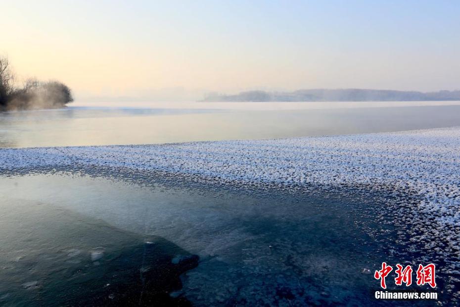 近日,受強冷空氣影響,地處甘肅省河西走廊中段的張掖市降溫降雪。該市濱河新區蘆水灣景區的湖面結冰,冰面上自然形成的冰花,猶如朵朵白花盛開,鋪滿了湖面。圖為湖面上寒氣蒸騰,冰花漂浮在水面。陳禮 攝