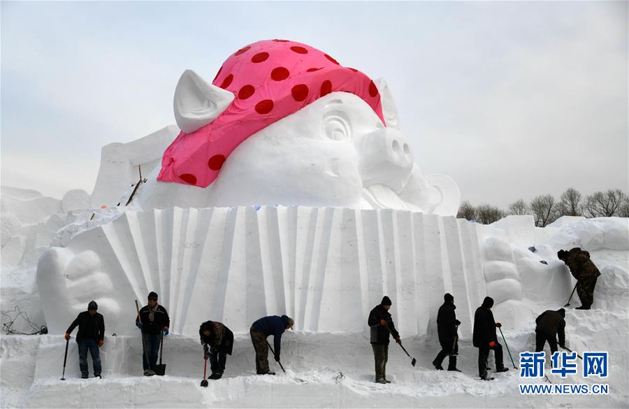 雪雕師在制作"歡樂金豬"主題雪雕(12月12日攝)。 新華社記者王建威攝