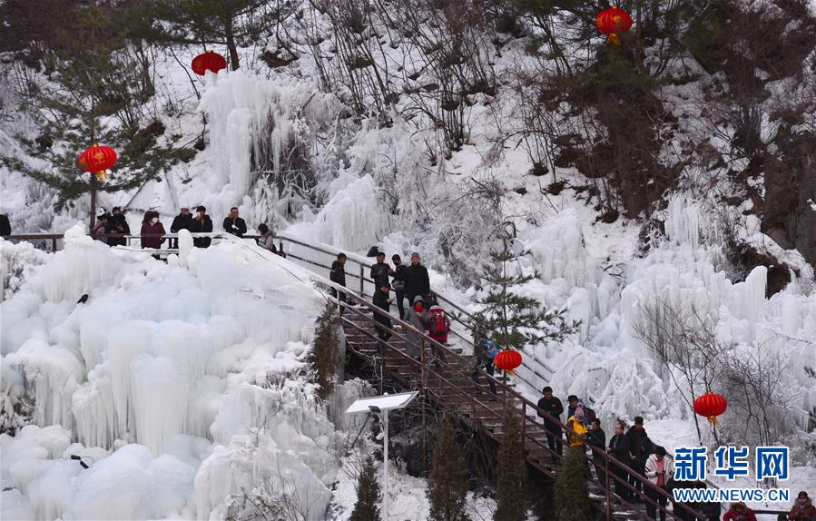 12月16日,游客在甘肅省大敦峽景區(qū)觀賞冰瀑。