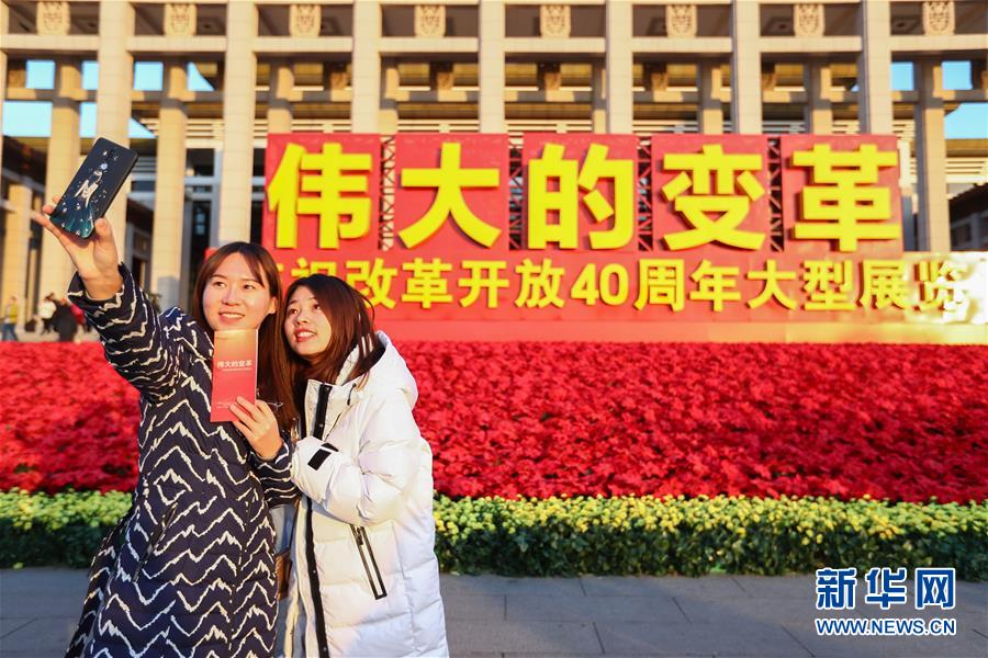 12月18日,參觀者在“偉大的變革——慶祝改革開放40周年大型展覽”外自拍留影。 截至當日,在中國國家博物館舉行的“偉大的變革——慶祝改革開放40周年大型展覽”累計參觀人數突破160萬人次。 新華社記者 張玉薇 攝