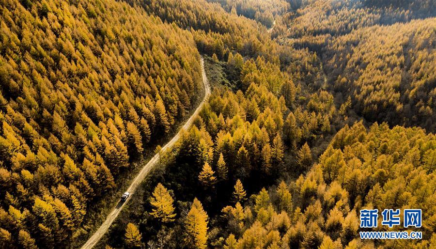 2018年10月8日,一輛汽車行駛在山西省沁源縣好地方林場的林間道路上。大地之色,俯仰之間;壯美山河,是我的祖國。2018年,新華社記者操縱無人機“飛閱”華夏大地,在最美的時節,定格下她的色彩斑斕。新華社記者 陶明 攝