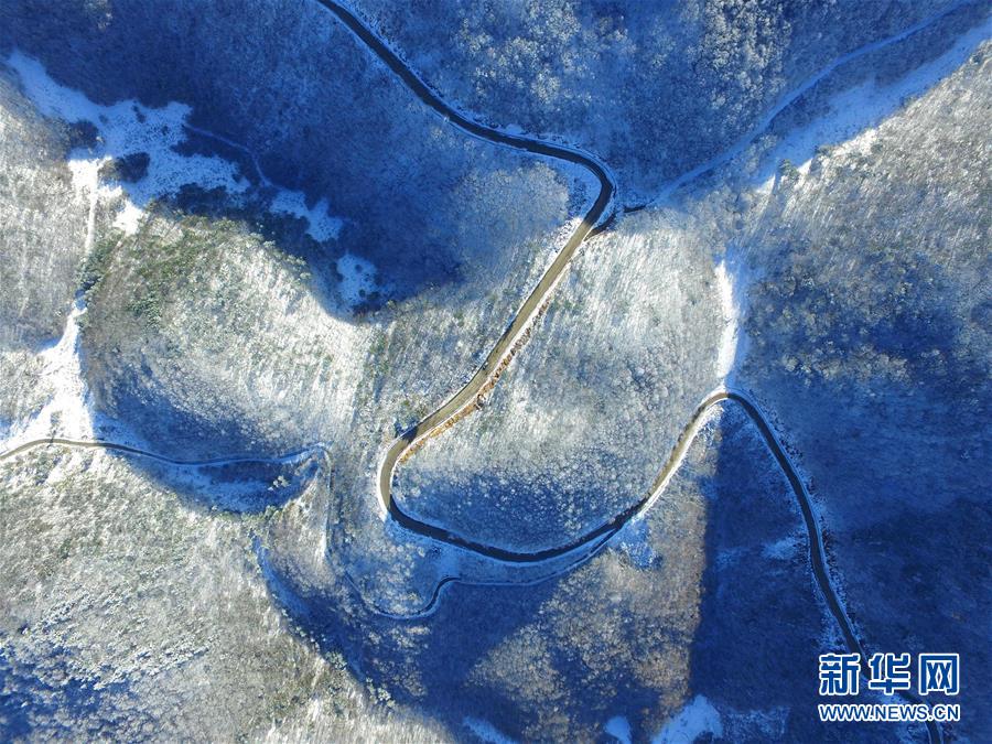2018年11月18日在湖北省保康縣龍坪鎮大水林場航拍的雪景。大地之色,俯仰之間;壯美山河,是我的祖國。2018年,新華社記者操縱無人機“飛閱”華夏大地,在最美的時節,定格下她的色彩斑斕。新華社發(楊韜 攝)