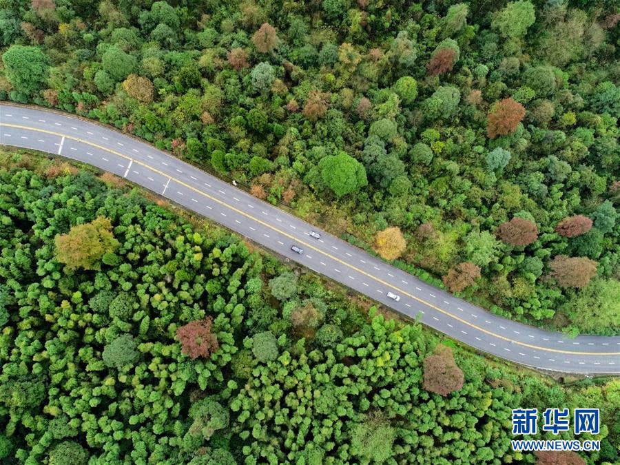 2018年11月21日,車輛行駛在國(guó)家第一條四車道盤山公路泰井高速上。大地之色,俯仰之間;壯美山河,是我的祖國(guó)。2018年,新華社記者操縱無(wú)人機(jī)“飛閱”華夏大地,在最美的時(shí)節(jié),定格下她的色彩斑斕。新華社記者 胡晨歡 攝
