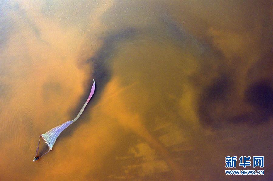 2018年7月6日,捕撈人員在山西運城鹽湖內捕撈鹽水蟲。大地之色,俯仰之間;壯美山河,是我的祖國。2018年,新華社記者操縱無人機“飛閱”華夏大地,在最美的時節,定格下她的色彩斑斕。新華社記者 曹陽 攝