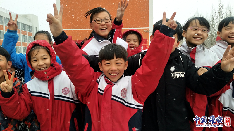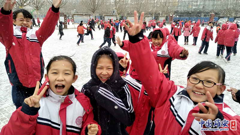 12月26日,雄安新區雄縣第三小學的學生在雪中歡聲笑語,迎接雄安新區2018年入冬來的第一場大雪。圖片由雄縣縣委宣傳部提供