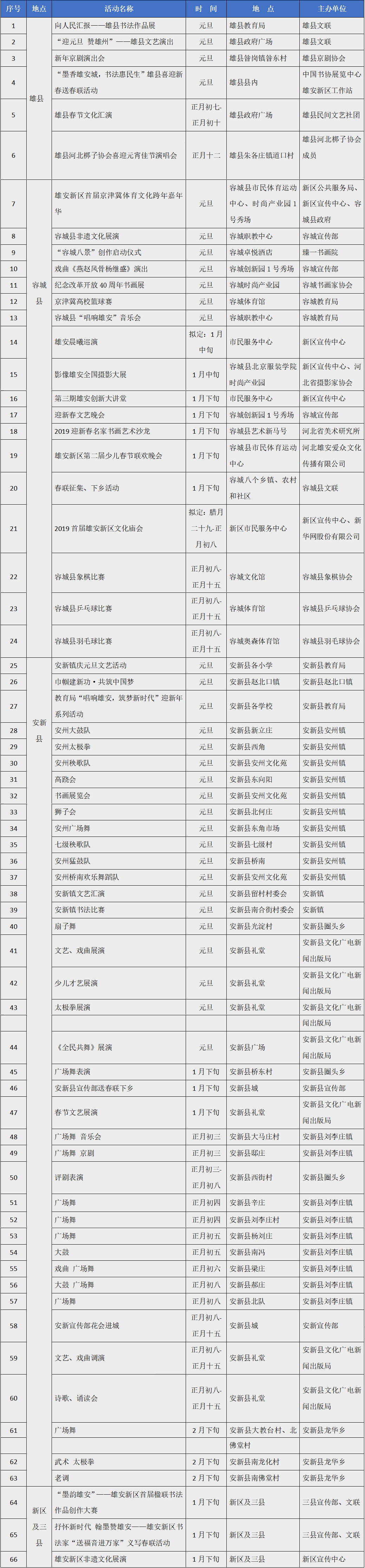 中國雄安官網12月29日電 元旦、春節將至,為深入貫徹落實雄安新區宣傳思想文化工作會議精神,弘揚優秀傳統文化,進一步豐富和活躍廣大群眾節日文化生活,確保新區人民度過歡樂喜慶、文明祥和的節日,新區宣傳中心將組織新區相關部門及三縣委宣傳部、文廣新局、文聯廣泛開展2019年元旦、春節期間群眾文化活動。活動內容豐富多彩,先來一睹為快吧!