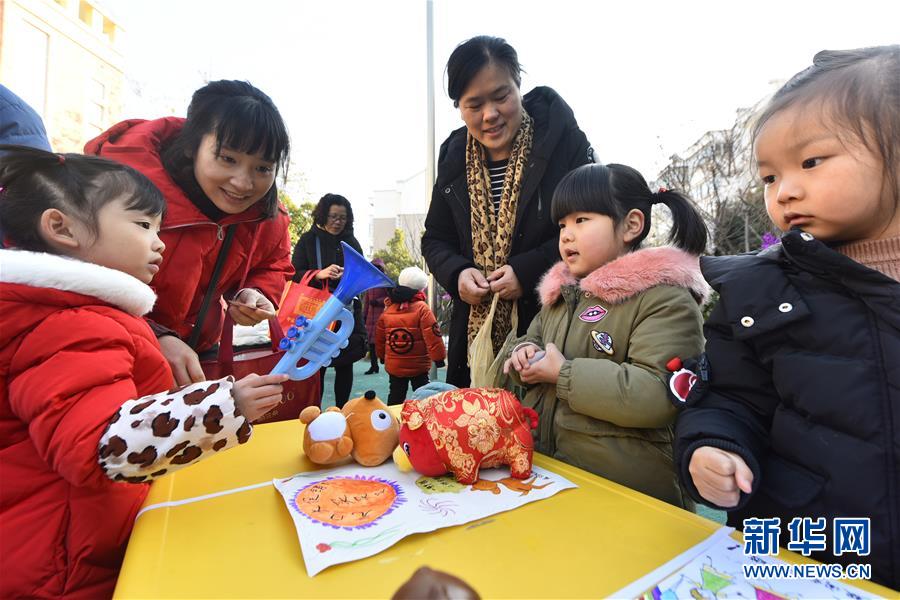 12月29日,安徽省合肥市蜀山區大地幼兒園的小朋友們在迎新年“寶貝當家”跳蚤市場進行物品“交易”。新年臨近,人們以各種各樣的方式迎接新年,表達對新年的祝福。新華社發(葛宜年 攝)