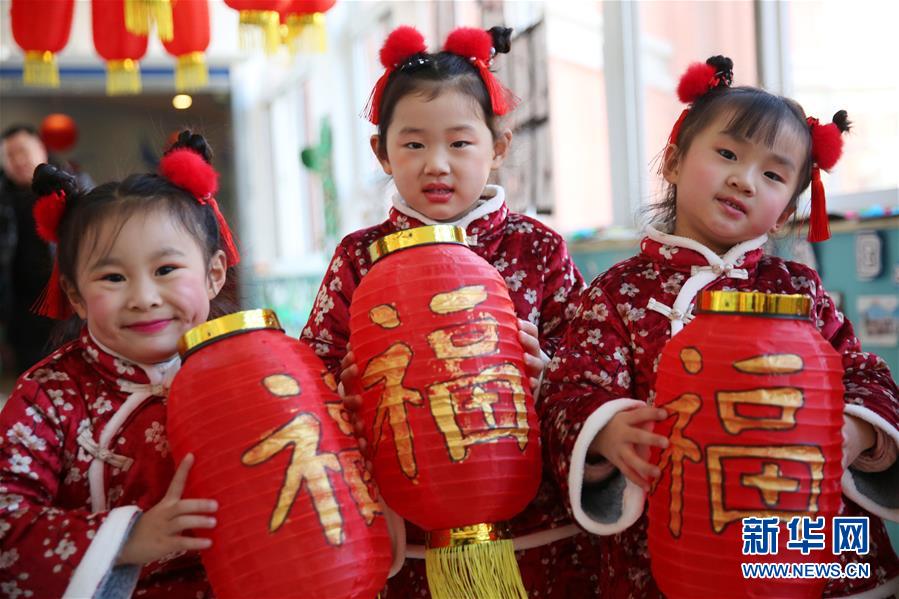 12月29日,安徽省淮北市鳳凰幼兒園的孩子們在民俗迎新年活動中手拿紅燈籠拍照。新年臨近,人們以各種各樣的方式迎接新年,表達對新年的祝福。新華社發(李鑫 攝)