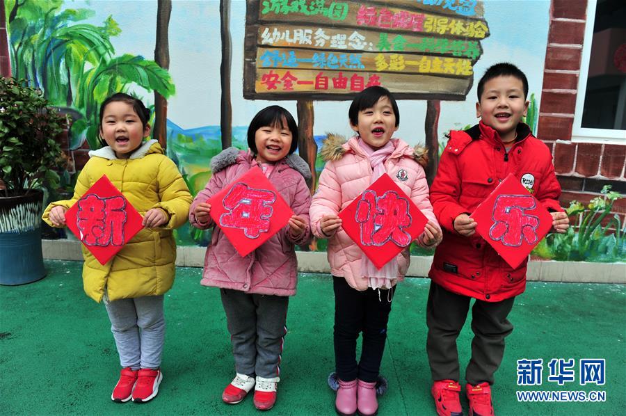 12月29日,湖北省秭歸縣金蘋果幼兒園的孩子們在展示“新年快樂”字樣。新年臨近,人們以各種各樣的方式迎接新年,表達對新年的祝福。新華社發(王輝富 攝)