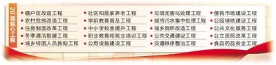 這20項民心工程包括棚戶區改造、農村危房改造、住房制度改革、冬季清潔取暖、城鄉特困人員救助、社區和居家養老、學前教育普及、中小學校舍提升、職業教育和就業培訓、公用設施建設、垃圾無害化處理、城市污水集中處理、城鄉廁所改造、公共交通建設、交通秩序整治、便民市場建設、公園綠地建設、公共文化服務、公立醫院改革和食品藥品安全等工程。